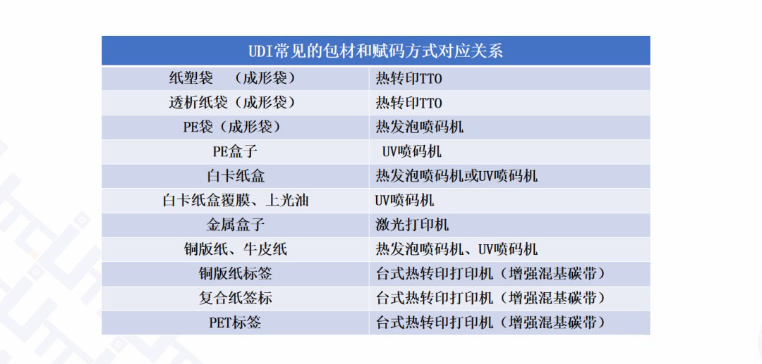 標(biāo)簽作為UDI賦碼的載體需要附著在產(chǎn)品包裝上,因而包裝的材質(zhì)和賦碼打印方式之間也是有著對應(yīng)關(guān)系的。比如,金屬類的材質(zhì)表面就更適合應(yīng)用激光打碼。