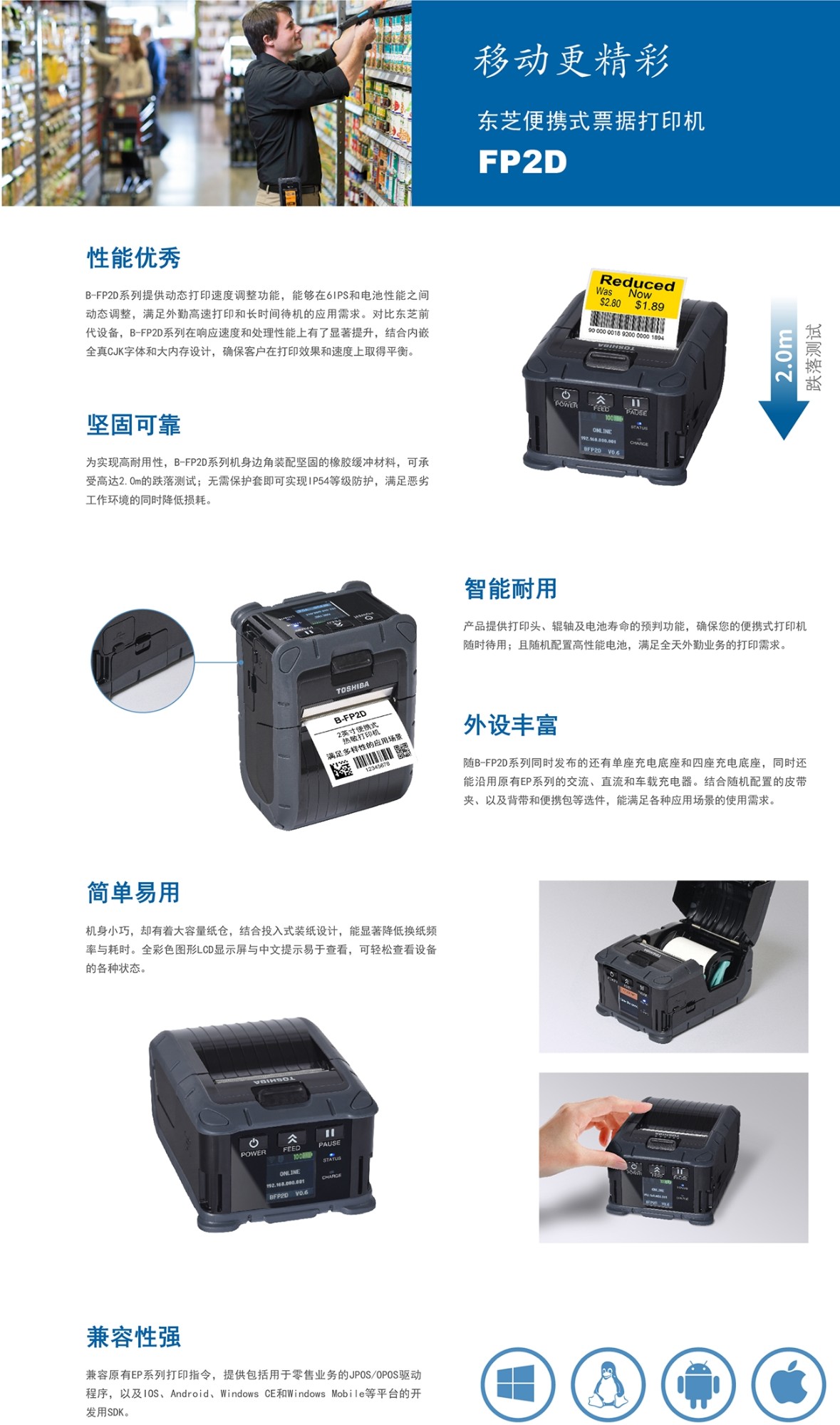 東芝致力于便攜式打印機領域的創(chuàng)新技術與應用開發(fā);B-FP2D系列專為用戶體驗而設計,堅固緊湊的機體結構,輕巧、易于操作;擁有2英寸便攜機的打印速度和電池性能,滿足多樣性的應用場景。