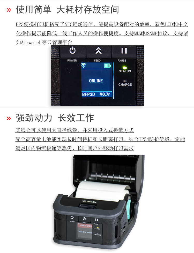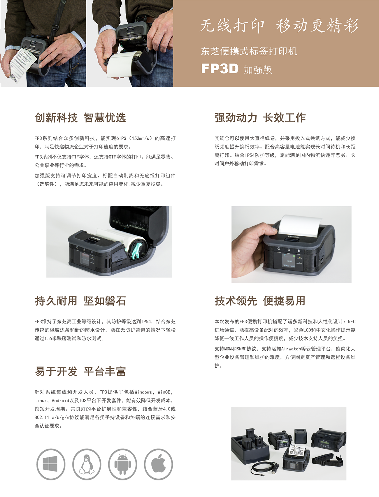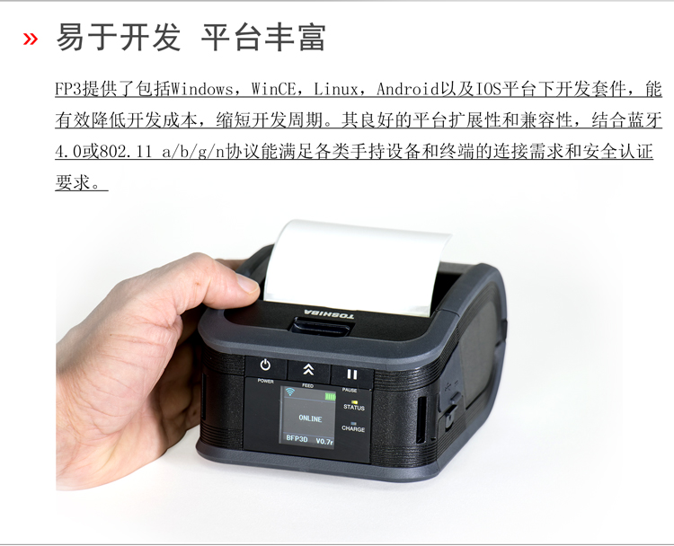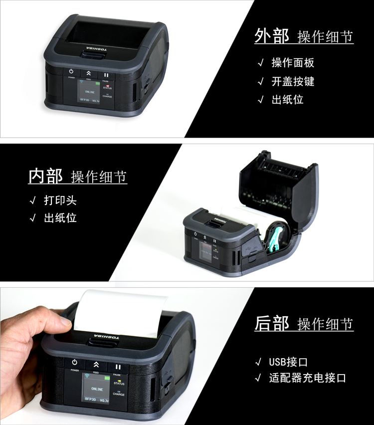 東芝將創(chuàng)新移動(dòng)打印技術(shù)帶到你的手中,F(xiàn)P3D加強(qiáng)版3寸便攜式熱敏打印機(jī),擁有6IPS(152mm/s)高速打印、彩色中文液晶屏、自動(dòng)剝離等技術(shù),蘊(yùn)含著東芝對(duì)于便攜性、可靠性、高性能和創(chuàng)新性的承諾,滿足各類便攜打印的應(yīng)用需求。