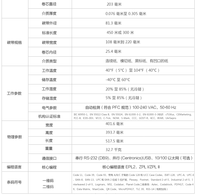 ZEBRA 220XI4打印機(jī)規(guī)格