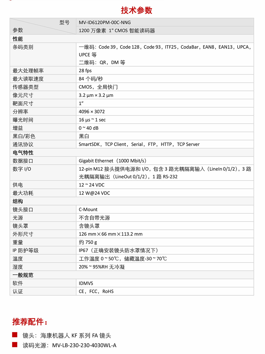 MV-ID6120PM-00C-NNG CMOS智能讀碼器